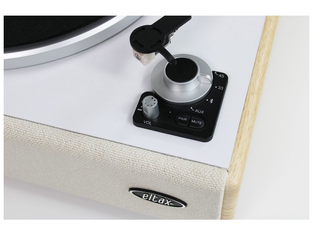 Gramofon Eltax Spinster je All-in-one řešení. Kombinuje gramofon a stereofonní reproduktory v jednom zařízení. Není potřeba zesilovač ani další reproduktory. Ke komfortu přispívá také podporovaný Bluetooth pro připojení externích zdrojů signálu.
